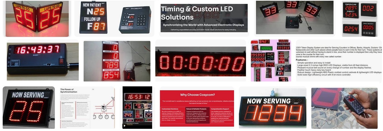 Cosycom is well-known for manufacturing custom LED display solutions across various sectors. Industrial & Factory Displays,production counters (up/down/count displays). Highly durable, retains data even after power outages. Timekeeping & Sports Displays.Industrial machine run-time stopwatches. Gym timers, race clocks, rally and marathon lap counters, Ethernet-enabled, GPS/NTP-synchronized LED digital clocks for precision timing ,Queue Management & Token Systems.Token number displays with optional human voice announcement. Used in banks, hospitals, restaurants, and various service centers. Specialty Displays. Manufacturers & Exporters of Digital LED Stopwatch Clocks, Token Number Displays / Queue Management Systems, Gym Exercise Fitness Clock,Digital Gym Clocks, Interval Timers, Sports Timing Equipment, Race Clocks, LED Sports Clocks, Time & Date Clocks. Sports Timing Equipments, record end-of-race results, Mile-Marker Race clocks. Pl. Visit http://www.cosycom.in for all product rates.